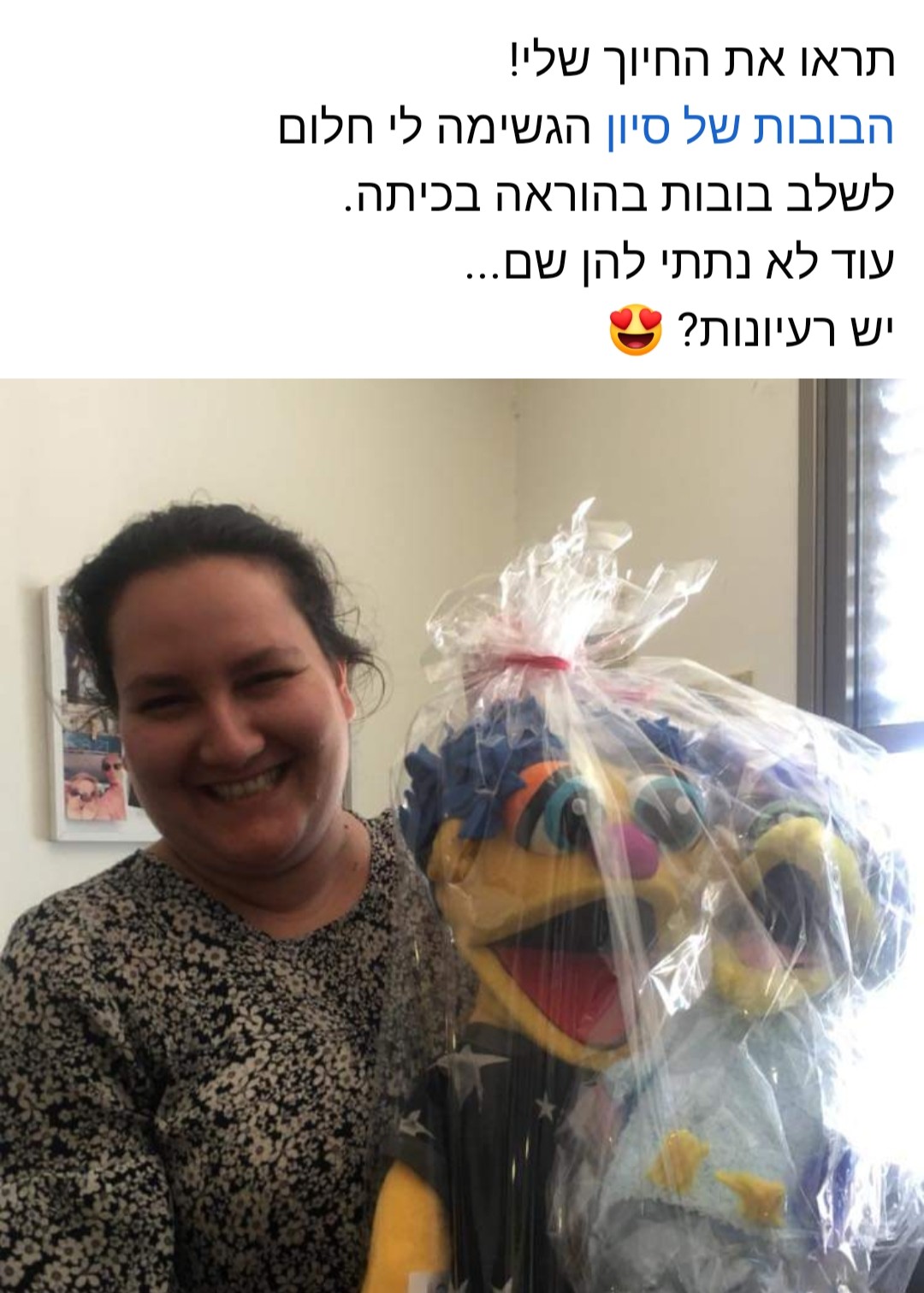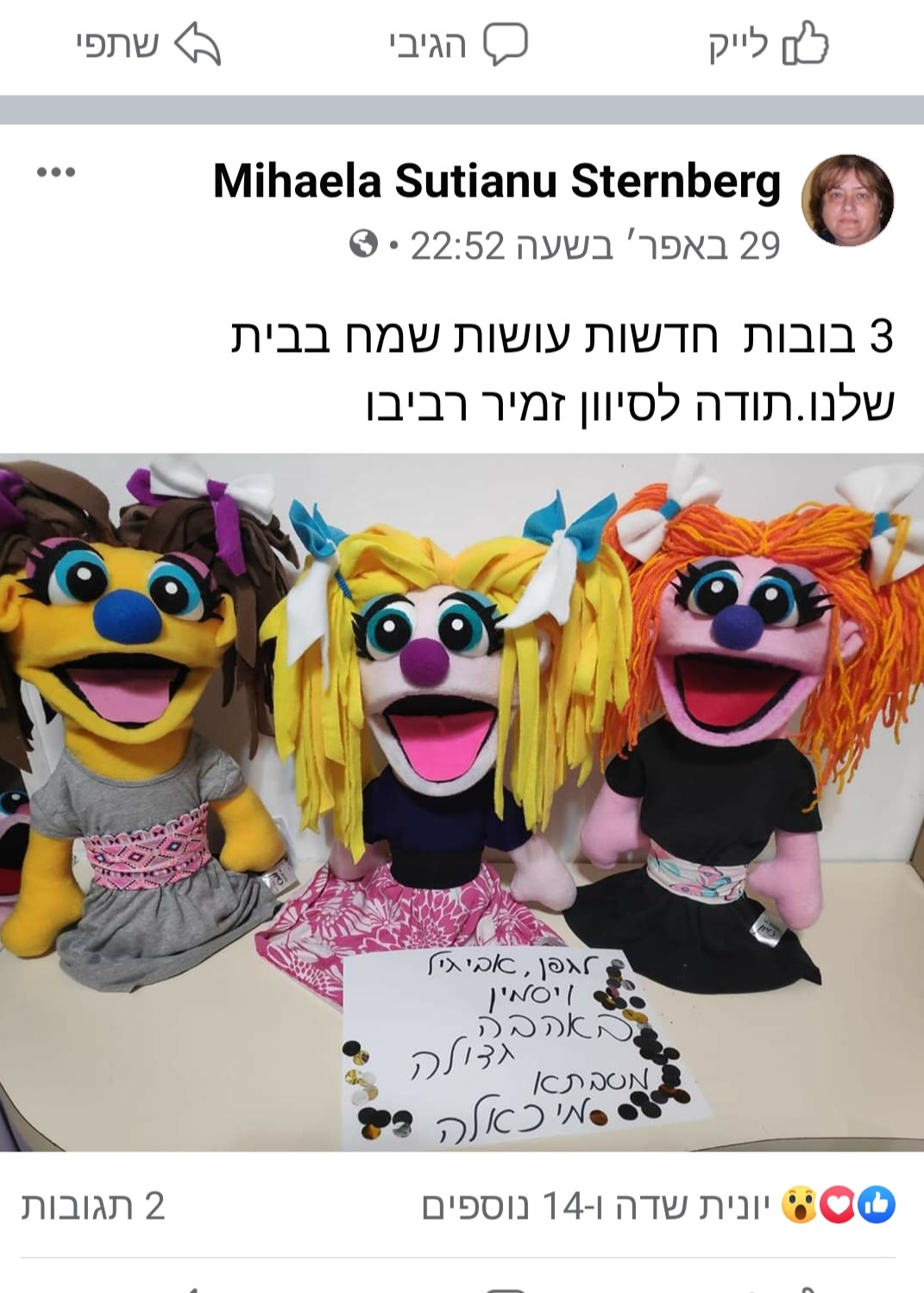 המלאי מתחדש כל הזמן – אז אם בובה מסוימת כבר מצאה בית, נשמח ליצור לכם אחת דומה או אולי אחות חדשה לדרך.