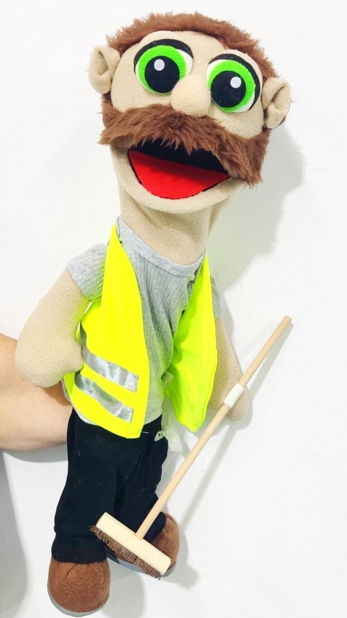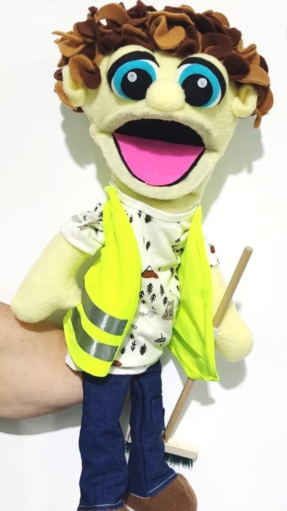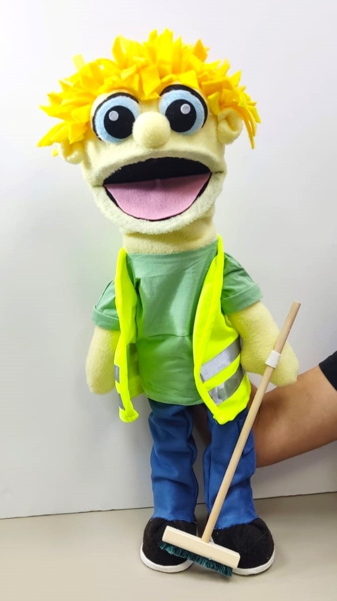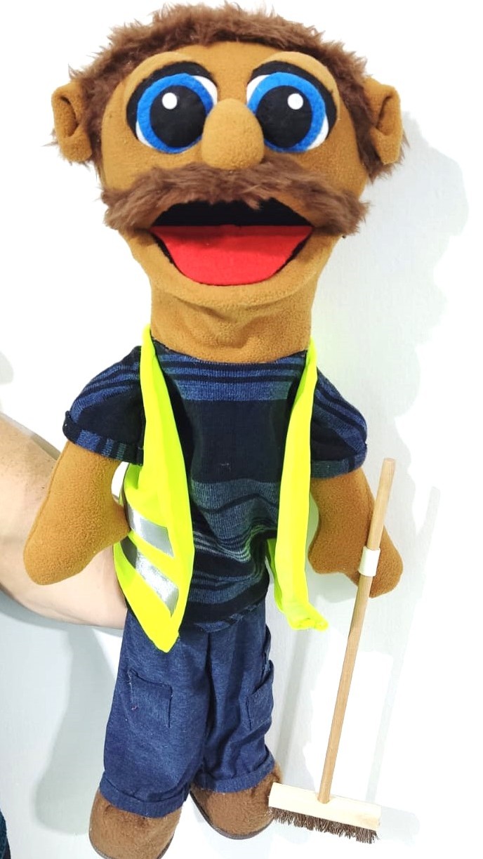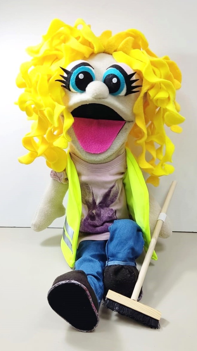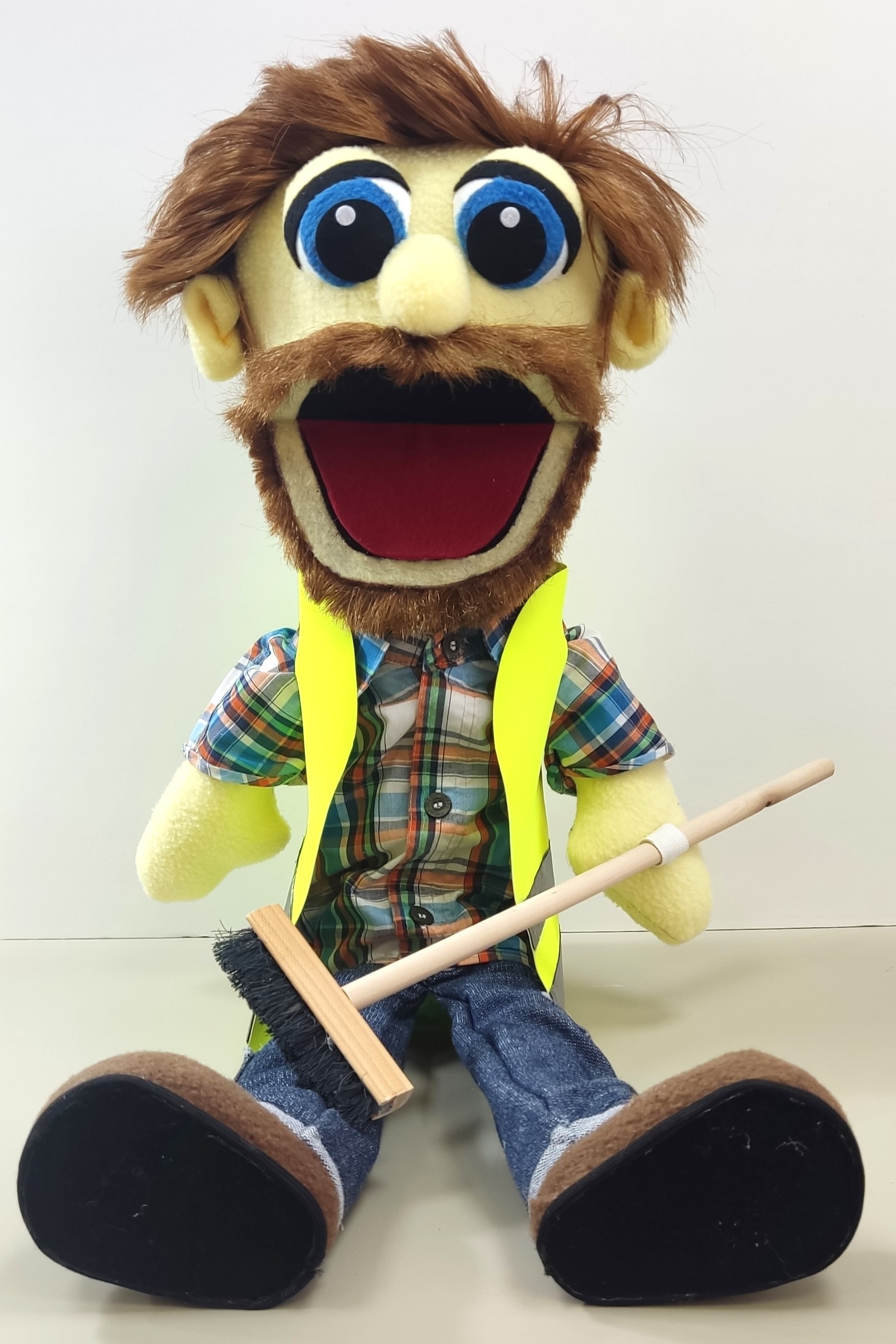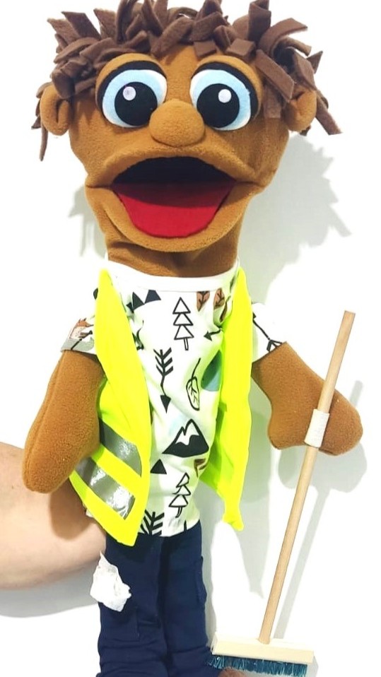 כן, בובת כף יד של עובד ניקיון, שמחזיקה מטאטא, מדברת בגובה העיניים –