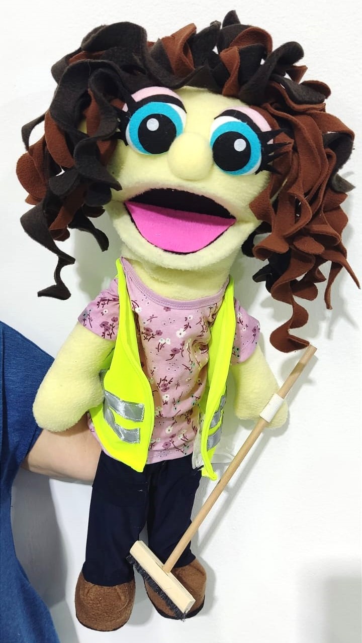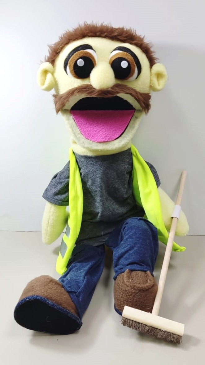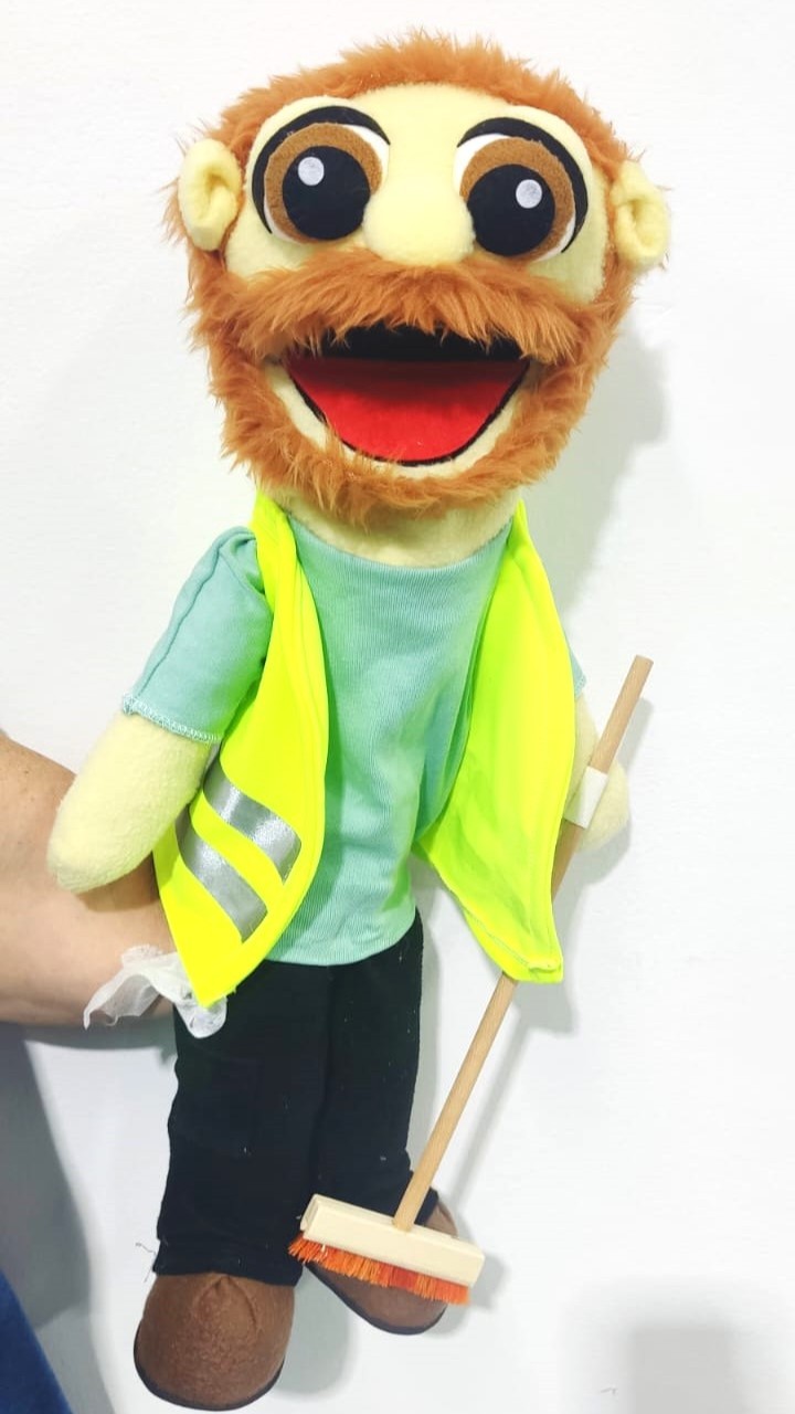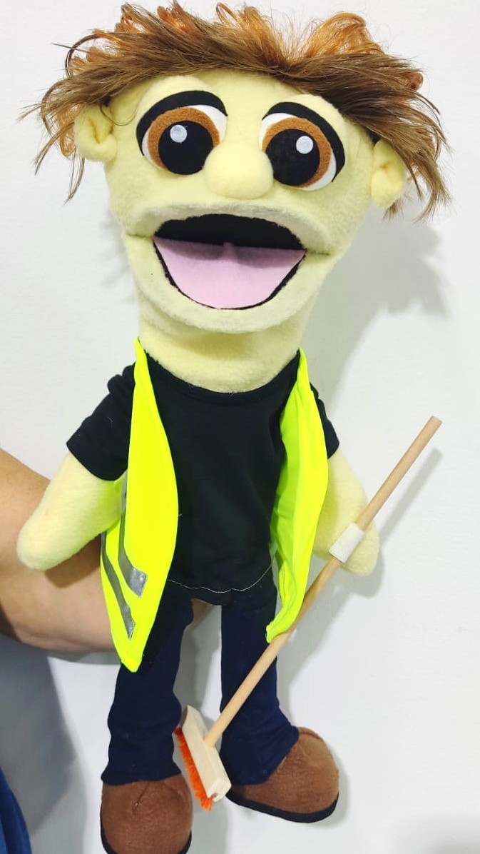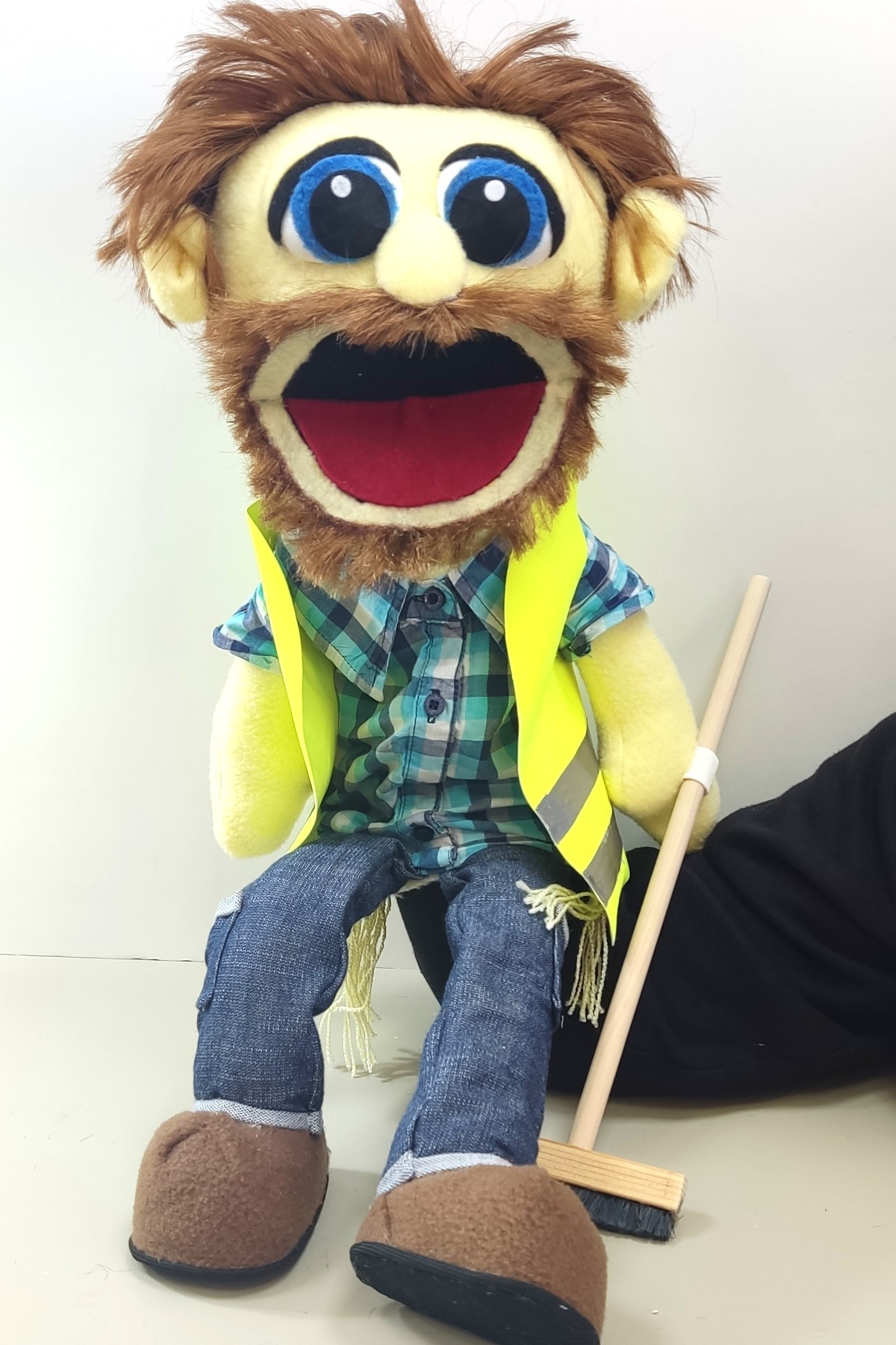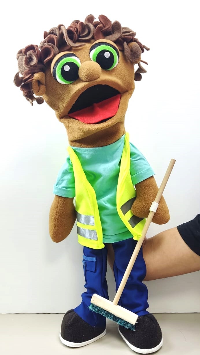 כן, בובת כף יד של עובד ניקיון, שמחזיקה מטאטא, מדברת בגובה העיניים –