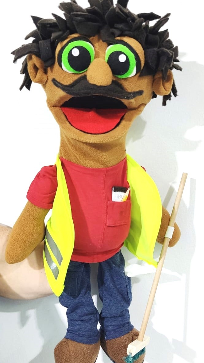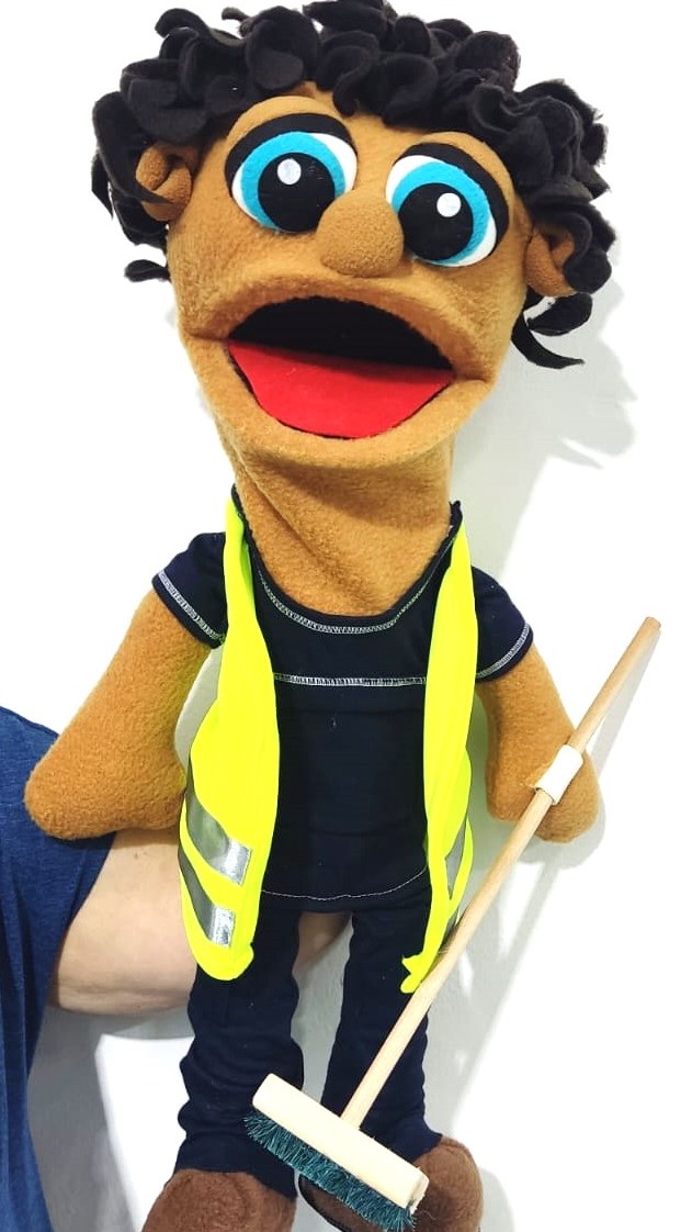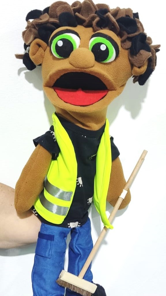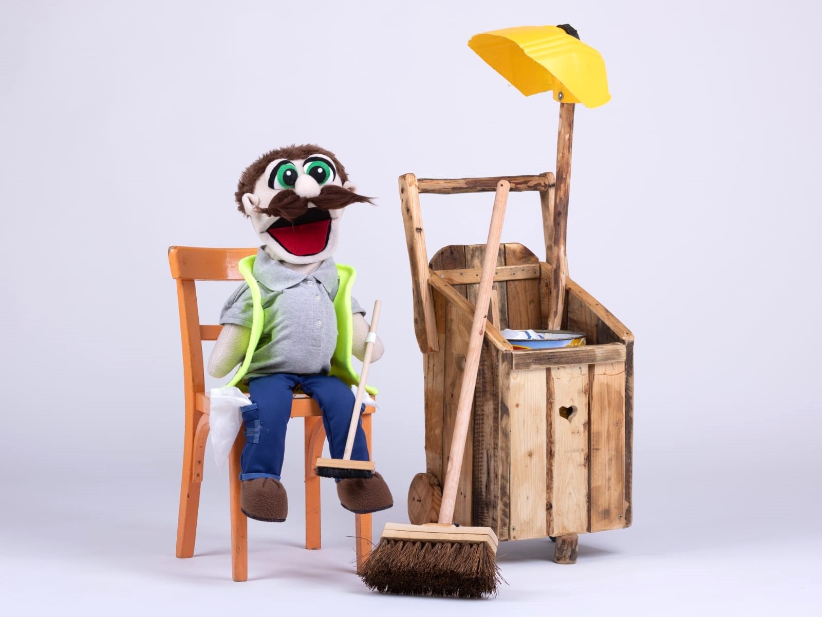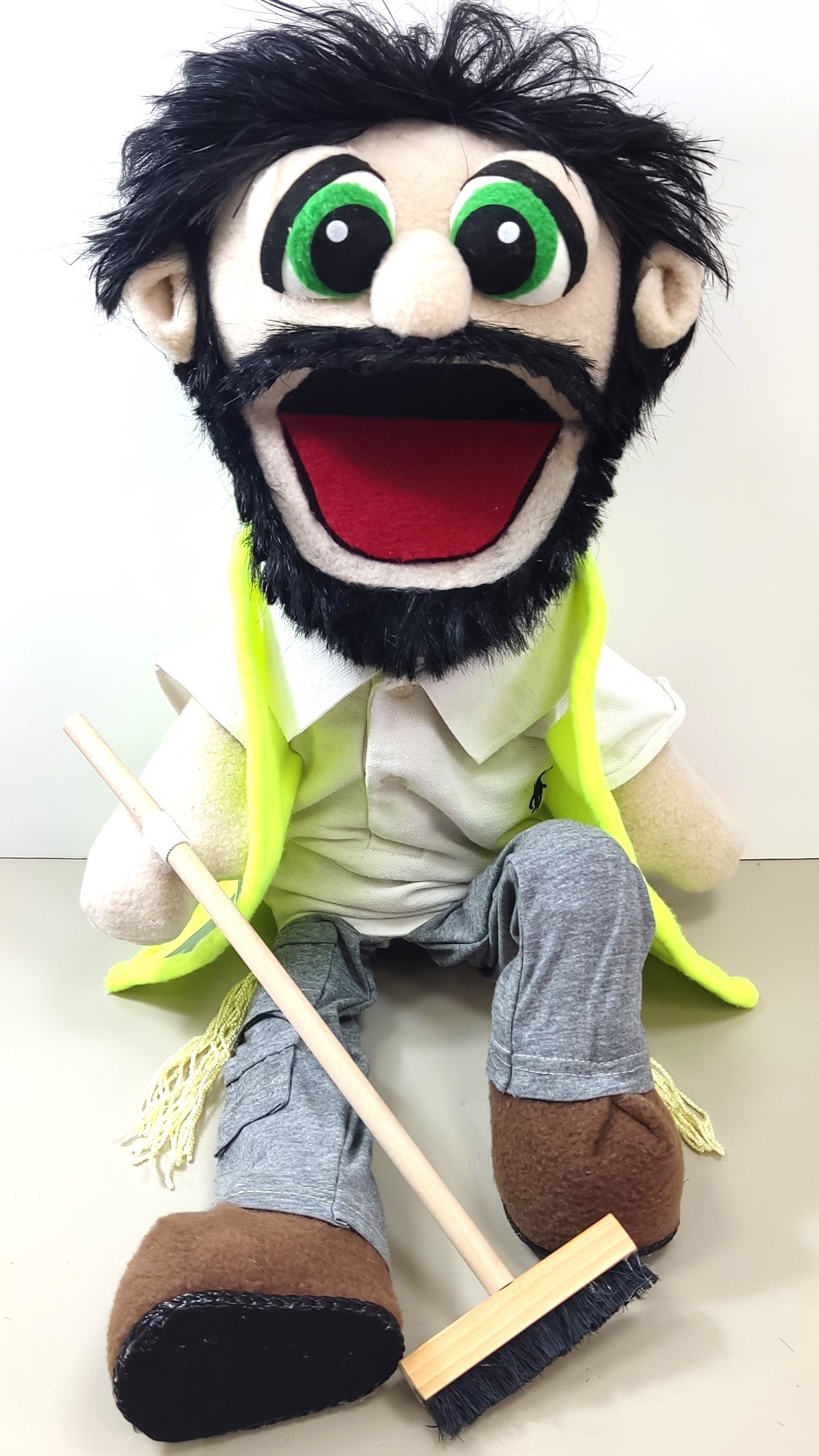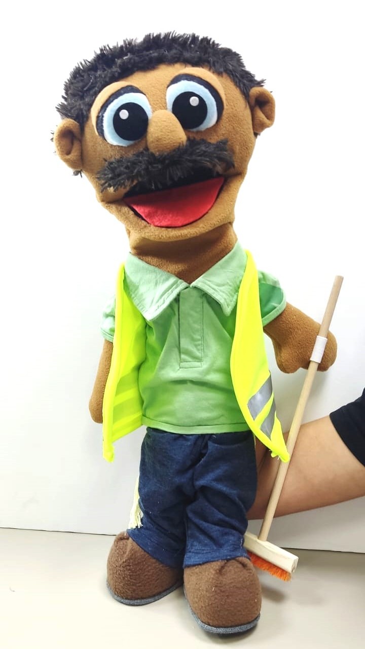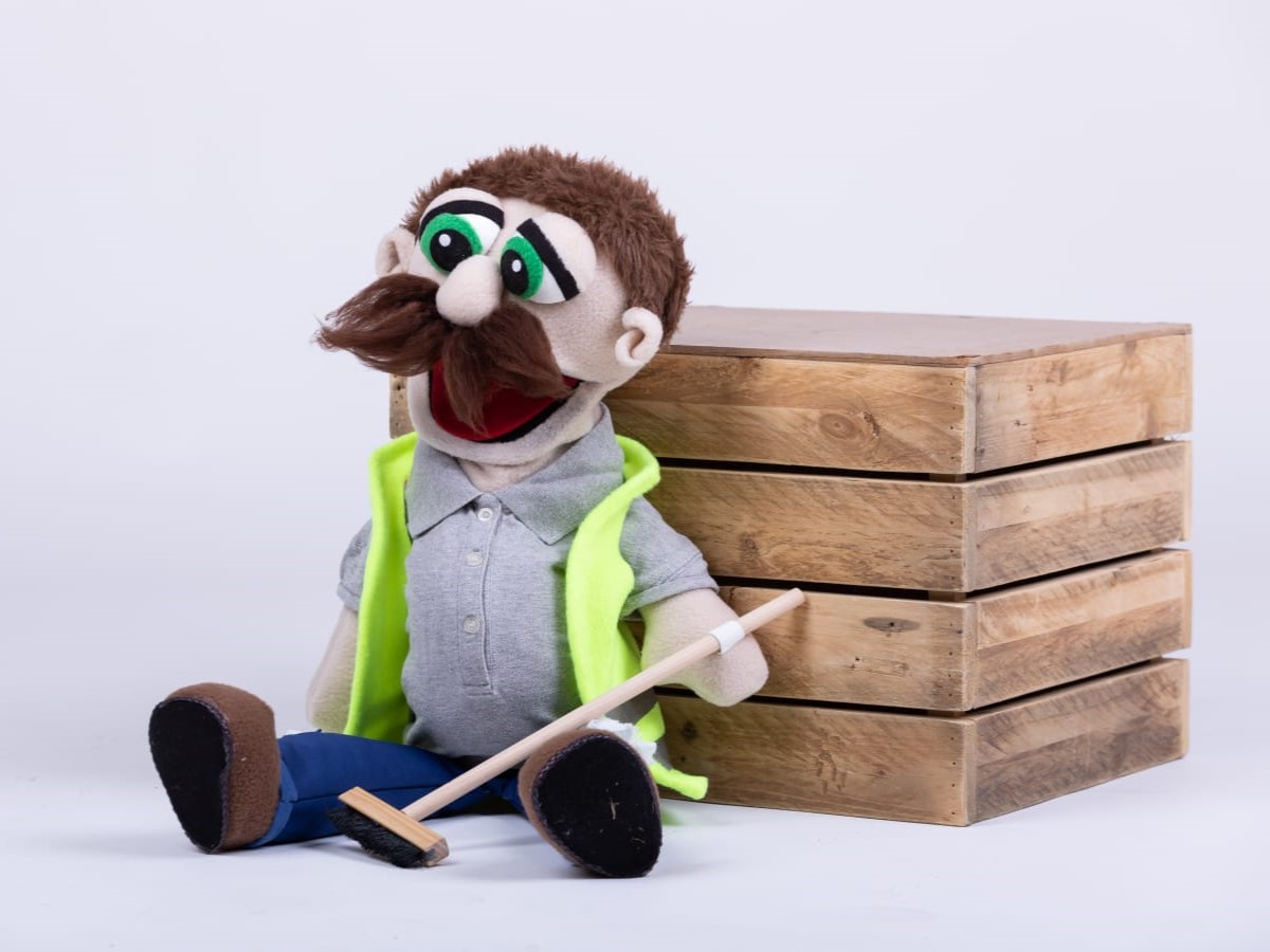 כן, בובת כף יד של עובד ניקיון, שמחזיקה מטאטא, מדברת בגובה העיניים –