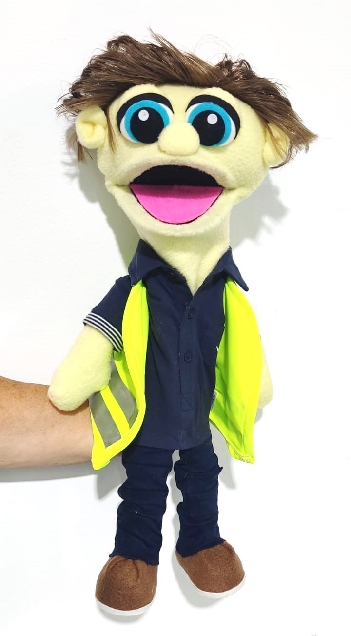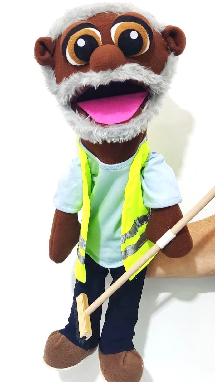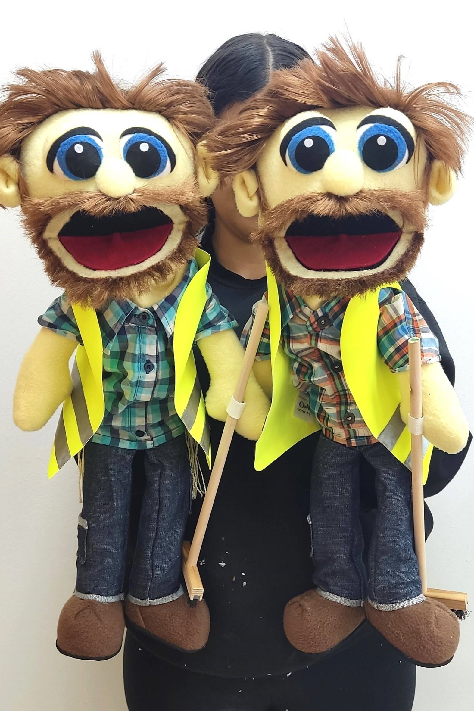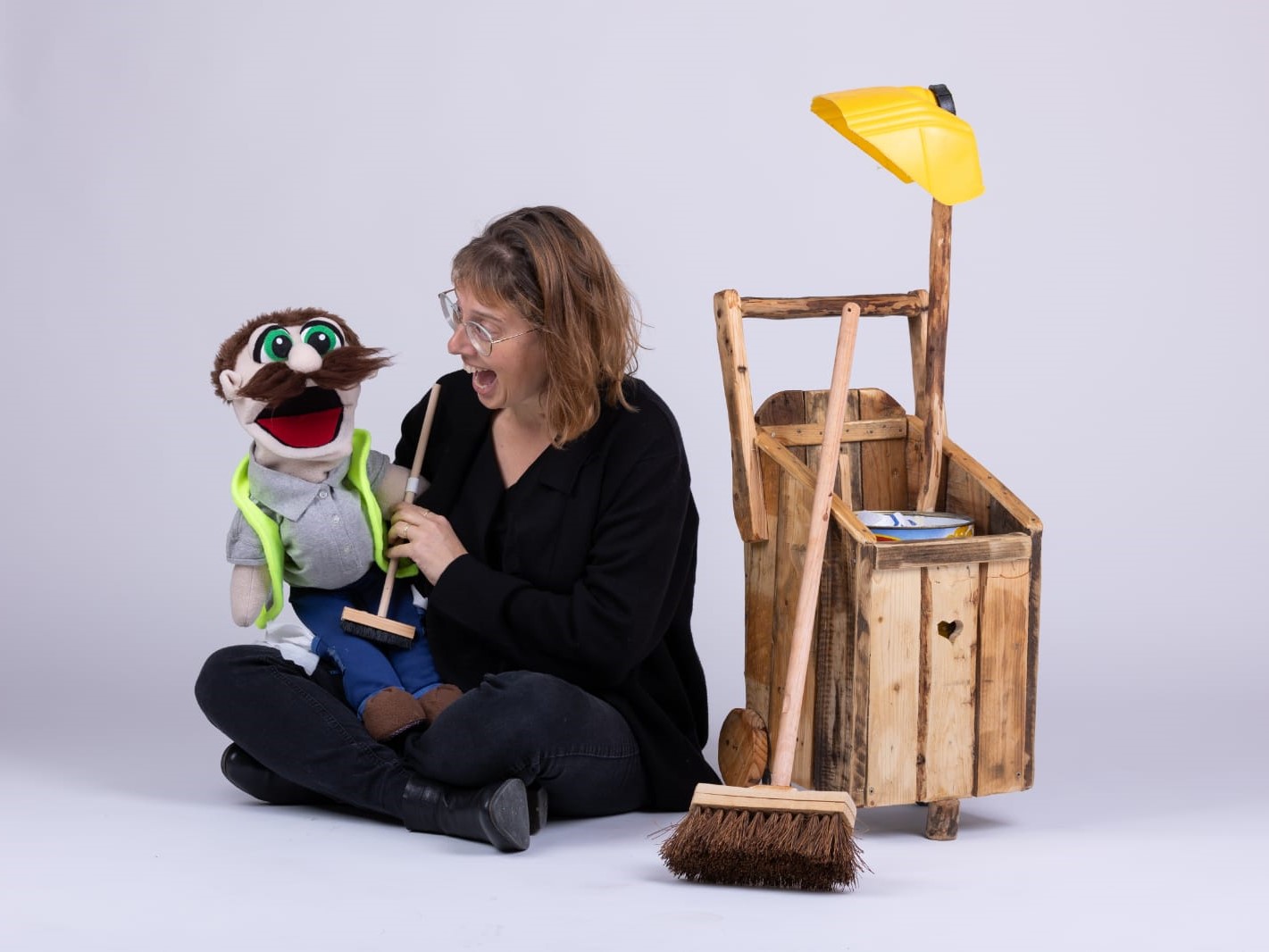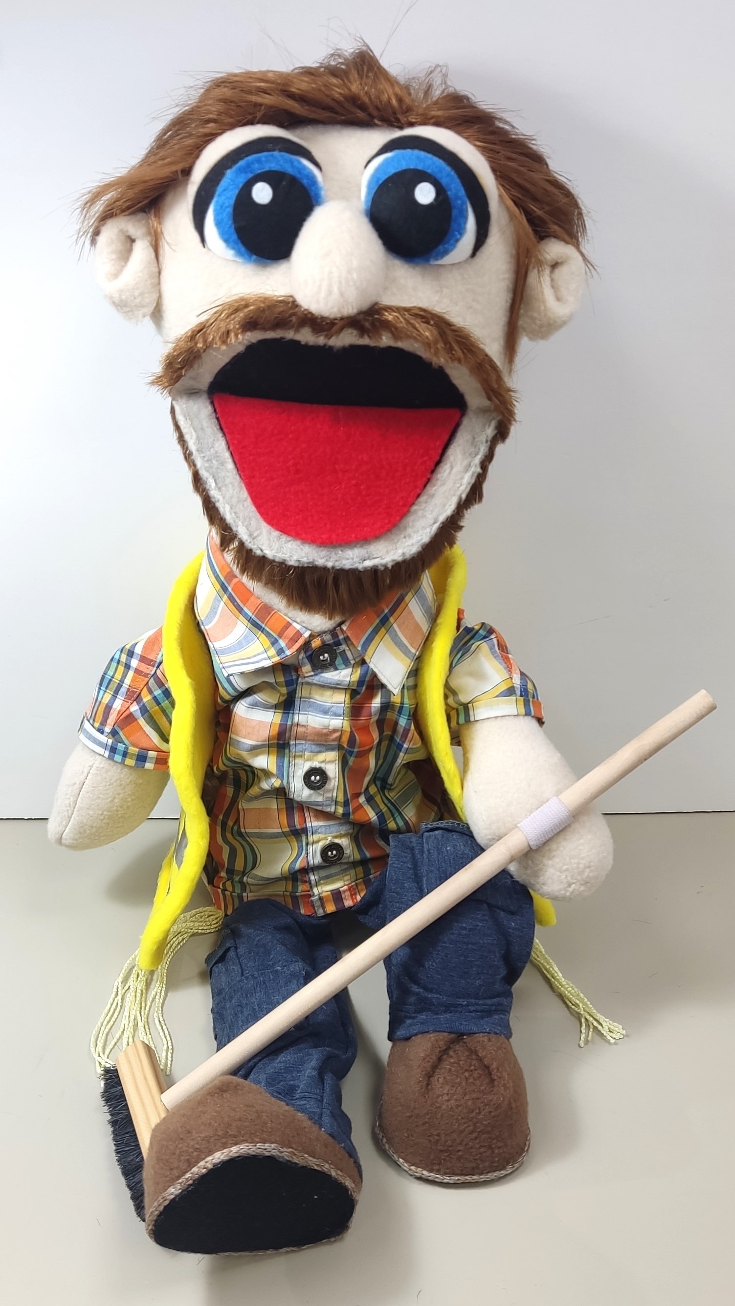 כן, בובת כף יד של עובד ניקיון, שמחזיקה מטאטא, מדברת בגובה העיניים –